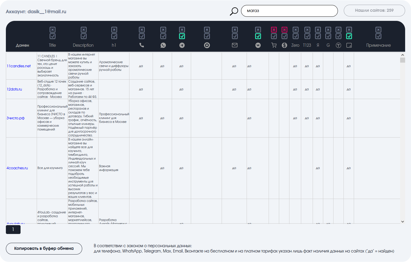 Поиск сайтов, сделанных на Тильде. Создание таблицы со ссылками на рабочие сайты и возможность её скопировать для сохранения. Удобный переход по доменам на сайты потенциальных клиентов. Подробная информация в таблице о каждом сайте с возможностью создания комментариев.